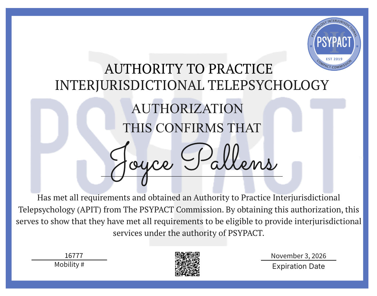 Dr. Pallens lives in Tennessee, where she provides in-person and telehealth services. Additionally, she provides services via telehealth to patients in Florida. Dr. Pallens holds Florida and Tennessee licenses in addition to being a PSYPACT-authorized provider (offering services in all eligible states).